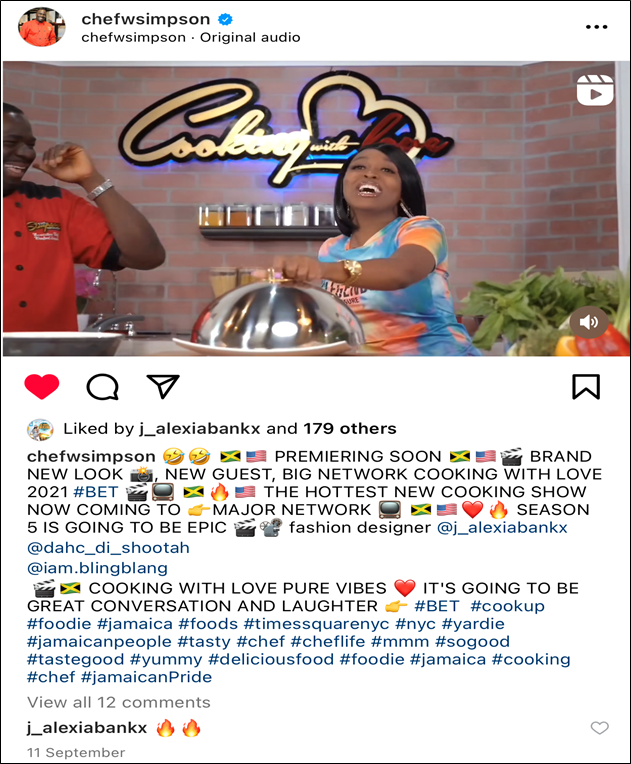 Since then, Thompson appeared as a guest on the new cooking show called Cooking With Love hosted by the world renowned Jamaican Chef Simpson. The program was originally broadcasted on Instagram for the first 4 seasons but for season 5, it will be aired on BET in the US, TVJ and CVM TV in Jamaica, Feva TV and CIN TV premiering on a date soon to be announced.