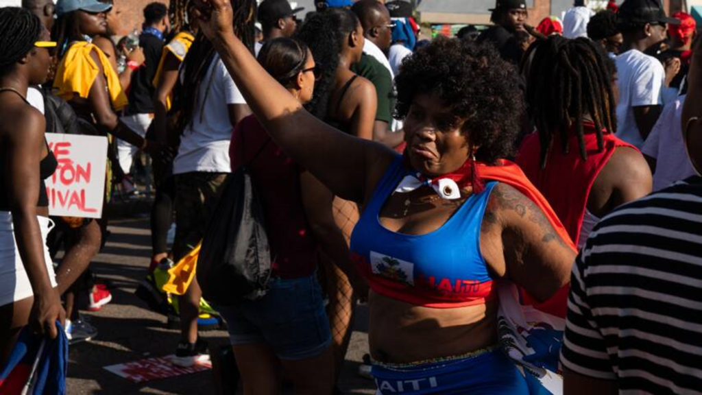 A woman waved a Haitian flag at Boston Carnival on Aug. 27, 2022