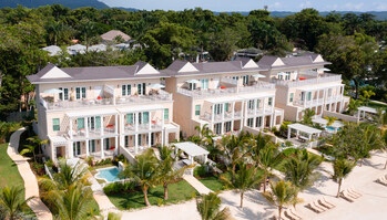 Pictured Here: Aerial view of the three-story Firesky Reserve Villas at Beaches Negril in Jamaica, offering three bedrooms and luxury amenities that include private pools and rooftops overlooking Seven Mile Beach.