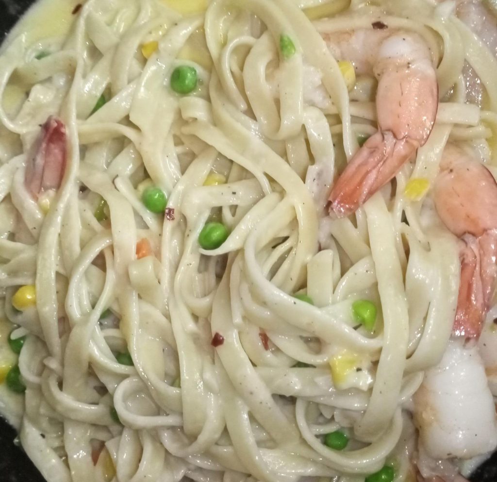 On high heat, melt butter in the skillet in which shrimp was cooked; add chopped garlic.  Stir butter and garlic occasionally.  Reduce heat to medium-heat; adding milk and heavy cream.  Bring liquid to a boil and slowly stir in cheese.  Reduce heat to low and continue to stir until cheese has melted – add veggies, wine, shrimp, salt and white pepper.