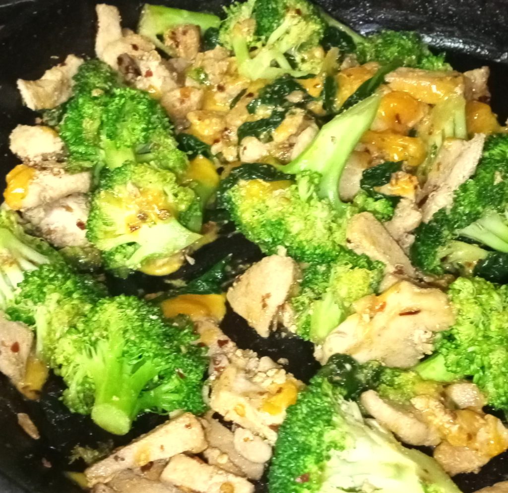 Using the same skillet, add broccoli and allow to cook for about 3 – 5 minutes. Add spinach midway.