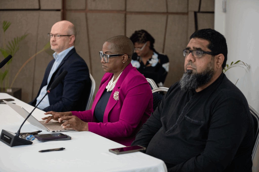 From right to left: Dr. Mohammed Nagdee, executive director of the Caribbean Centre for Renewable Energy and Energy Efficiency (CCREE); Peron Johnson, Permanent Secretary, Ministry of Climate Resilience, The Environment and Renewable Energy, Grenada; and Jari Vayrynen, Senior Energy Specialist, The World Bank