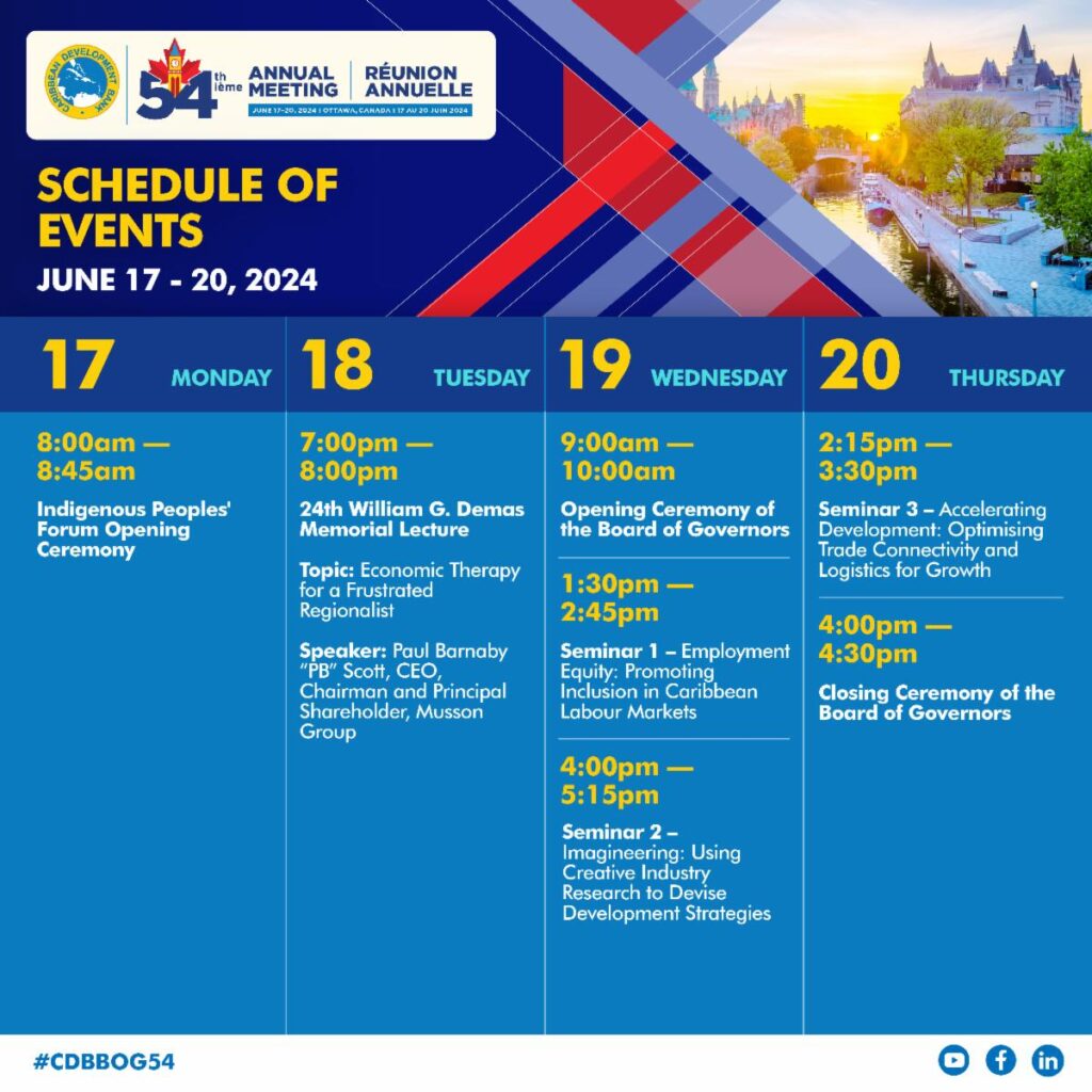 The 54th Annual Meeting of the Board of Governors of the Caribbean Development Bank will take place June 17-20, 2024, in Ottawa, Canada.
