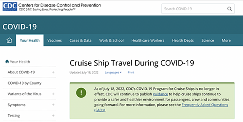 The U.S. Centers for Disease Control and Prevention (CDC) has announced the end of its voluntary Covid-19 program. As of July 18, 2022, the program is no longer in effect; rather, the CDC will provide general guidance to help cruise lines continue providing a safe and healthy environment for all passengers and crew members.