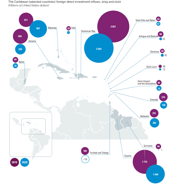 The report continued, “This trend was generalized in the region, with only five countries receiving more foreign capital in 2020 than in 2019. These countries were the Bahamas and Barbados in the Caribbean, Ecuador and Paraguay in South America, and Mexico.