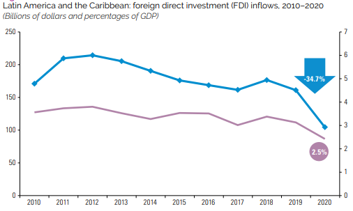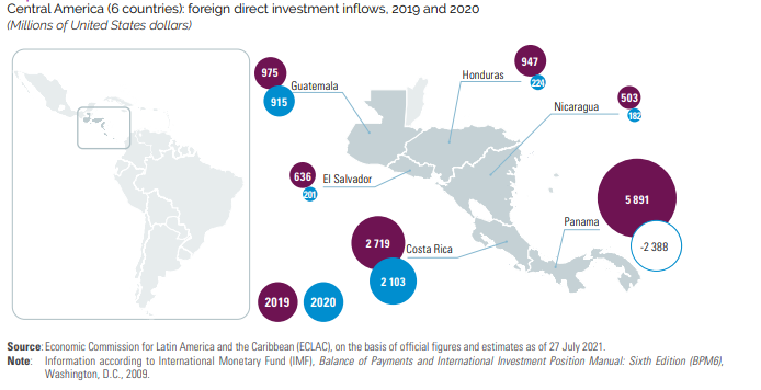 “In Central America, FDI inflows declined in all countries. The most notable case in this subregion was Panama: after a decade in which investment increased steadily, in 2020 it registered negative capital inflows in all components of FDI, with negative inflows in intercompany loans accounting for the largest share of the total figure. Inflows in the Caribbean decreased less than the regional average (-25.5 percent).”
