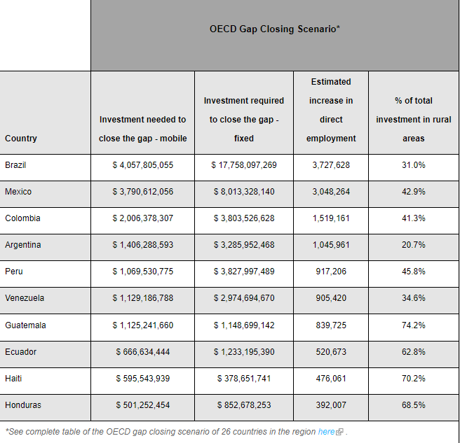 To close the gap, countries in the region would need $68.5 billion, according to the IDB.  Of the total, 59% should go to improving connectivity in urban areas, something which is mostly handled by the private sector. In contrast, 41% would go to rural areas, where public investment is typically the main source of funding. According to the study, more public-private partnerships are needed to close the gap with OECD countries.