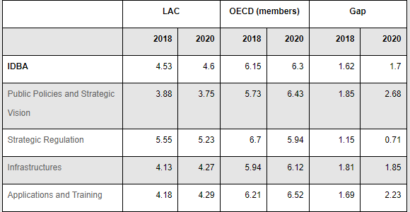 With regard to the index’s pillars, Latin America and the Caribbean reduced the Strategic Regulation gap in 2020 compared with 2018, whereas the gap grew dramatically in the Public Policies and Strategic Vision, and the Applications and Training pillars (see chart below). These gaps are caused by delays in the implementation of public policies and development of digital abilities to help take advantage of the new technologies in the region.
