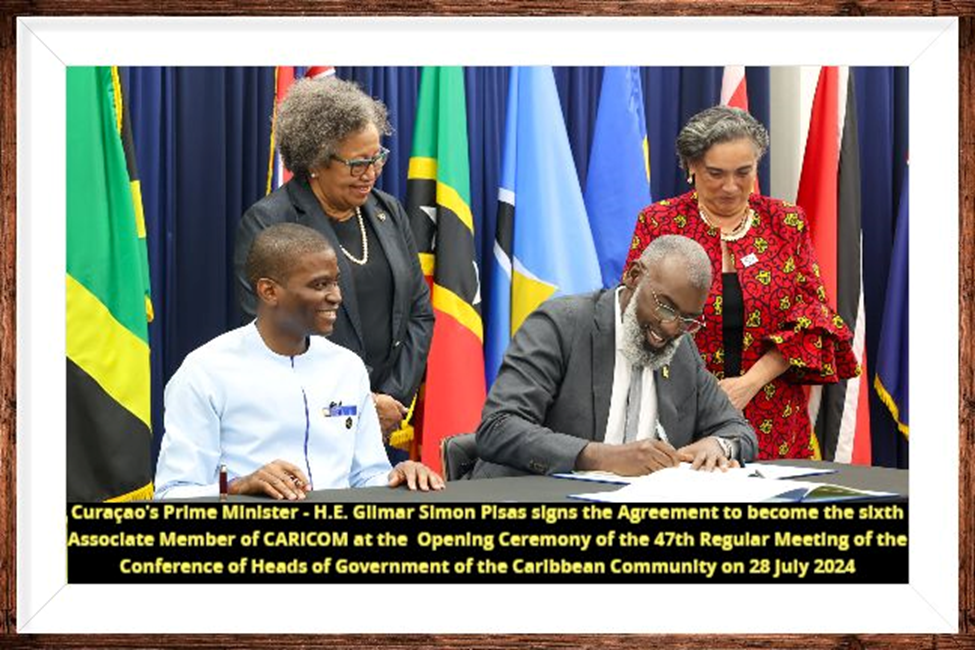 On Sunday, 28 July 2024, CARICOM Chairman, the Hon. Dickon Mitchell of Grenada, and Prime Minister of Curaçao, His Excellency Gilmar Simon Pisas signed the Agreement accepting Curaçao as an Associate Member of CARICOM during the Opening Ceremony of the 47th Regular Meeting of the Conference of Heads of Government in St. George’s Grenada.
