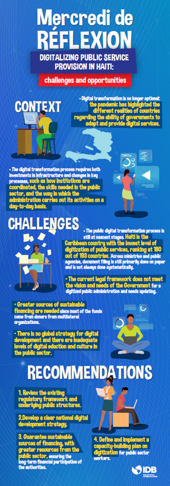 Understanding the political economy of digitalizing public sector was the theme of the May 5th “Mercredi de Réflexion”, a monthly meeting organized by the Inter-American Development Bank (IDB) in Haiti. The periodic gatherings provide a platform for key actors in Haiti to discuss relevant topics contributing the country’s economic development. The virtual event, moderated by Mr. Kesner Pharel, had the following guest speakers: Mrs. Takady M. Konaté and M. Alejandro Glass from the IDB, Mr. Guy Serge Pompilus and Mr. Wilson Fièvre from the Haitian Institute of Statistics and Information (IHSI) and Mr. Donald Marcellin from the Ministry of Finance (MEF).