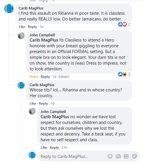Say “no wonder we have lost respect for ourselves, children and country, but then ask ourselves why we lost the respect and decency. Take a back seat, if you have no self-respect and class.” LOZ! I thought it was all of the dope smoking and drug dealing and the glorifying of “World Boss” and Dexta Daps that did it, not Rihanna’s, or anybody else’s, titties. *sigh*