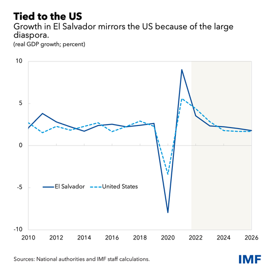 US real GDP growth is also an important growth driver because of the large Salvadoran diaspora. About one-fifth of the population is living in the US. They contribute to the Salvadoran economy by sending remittances to support their families—more than 25 percent of GDP in 2021.