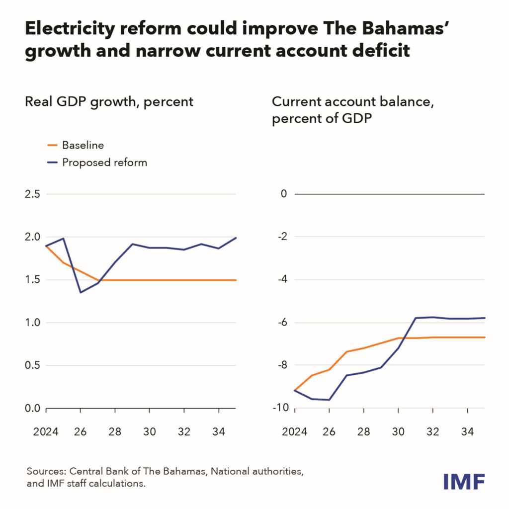 Modernizing electricity grids and increasing the shares of solar energy and liquified natural gas (LNG) in electricity production can yield major macroeconomic benefits in The Bahamas. Such transformations, over the medium-term, could reduce fossil fuel imports, decrease the country’s vulnerability to volatile global fuel prices, significantly reduce CO2 emissions, and substantially boost national output (eventually increasing long-run growth potential from 1.5 percent to 2 percent). These are just some of the many interesting findings using the IMF’s new Renewable Energy Balance of Payments tool. This tool estimates the impact of a shift in the mix of energy production on a country’s transactions with the rest of the world.