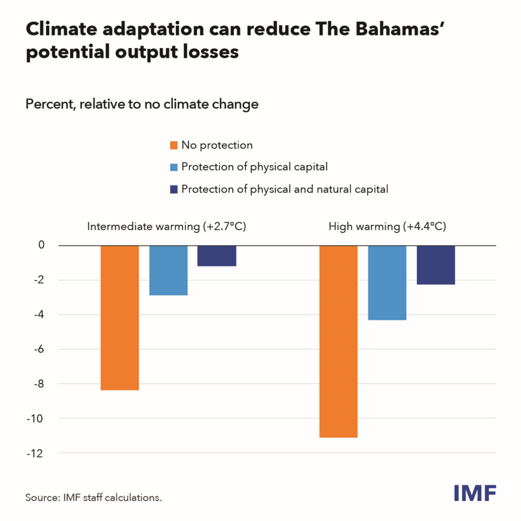 Unfortunately, even with these investments, the threat of climate change is here to stay. IMF analysis suggests that rising sea levels could place up to 41 percent of the land in The Bahamas and 22 percent of its population below sea level by the end of this century. Moreover, the country is positioned within the Atlantic hurricane belt, leaving it at high risk of hurricane damage. Left unaddressed, more severe natural disasters and slow-moving impacts from climate change could reduce The Bahamas’ national output by up to 11 percent by 2100, with larger losses in the islands whose economies rely most on hospitality and real estate.