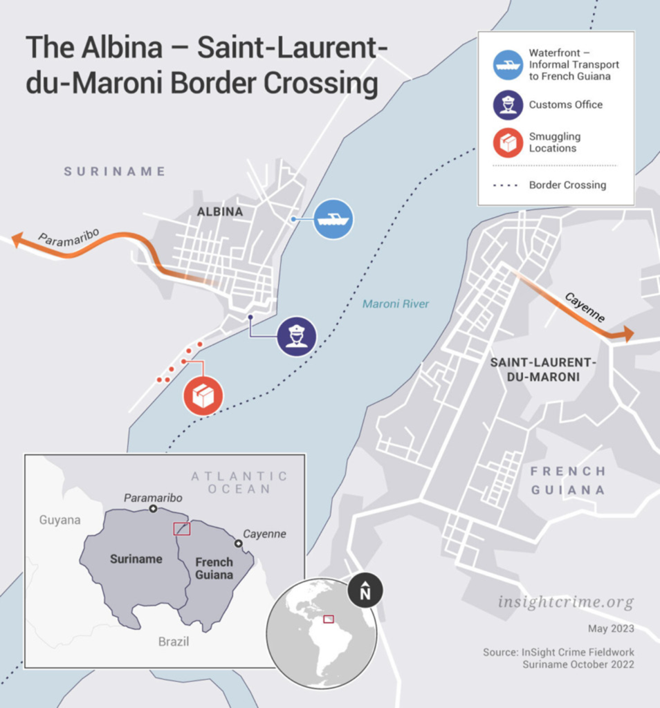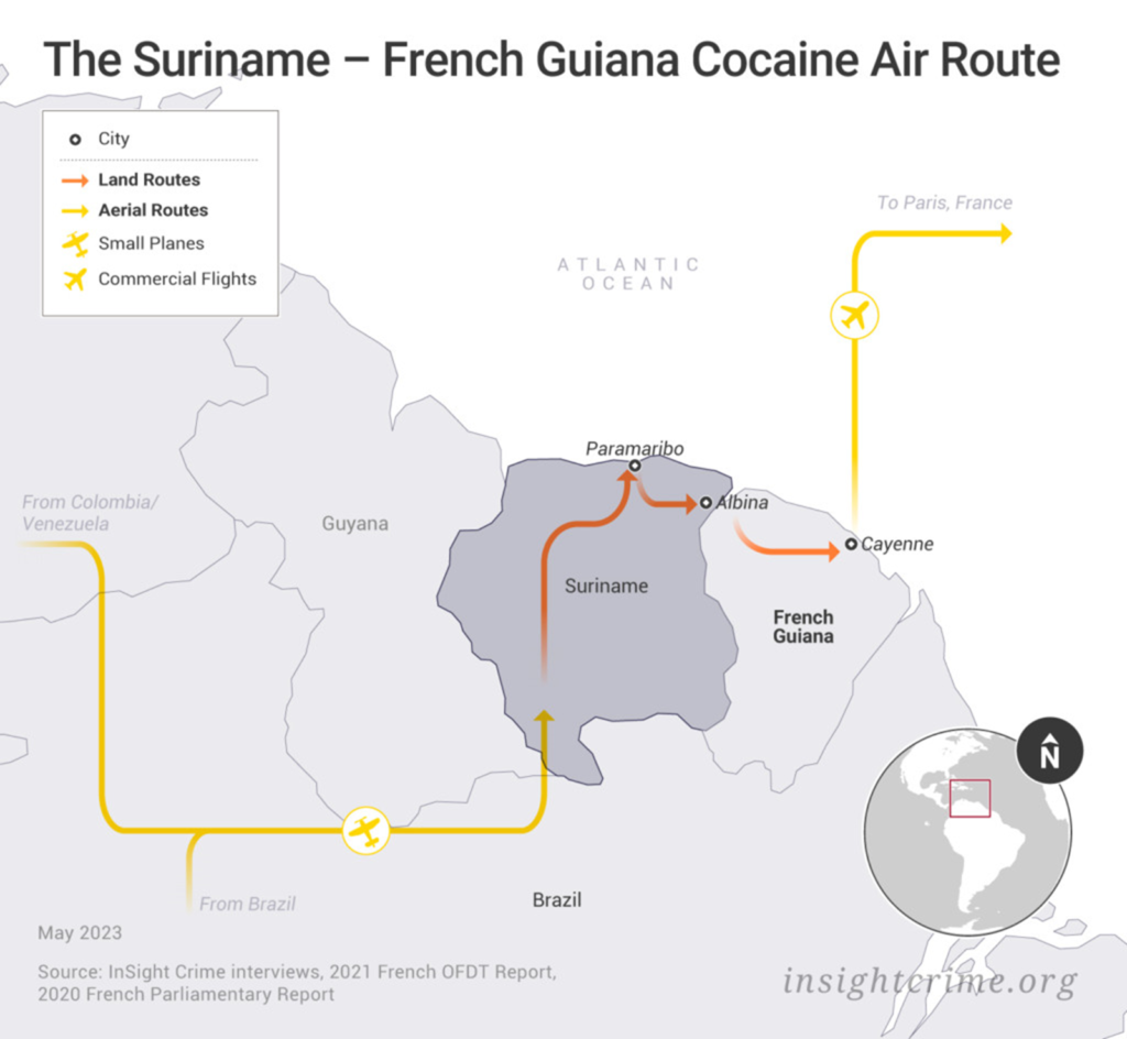 But while the scale of cocaine trafficking across the Suriname-French Guiana border is difficult to estimate due to a lack of seizure data, seizures on the French side suggest flows could be in the multi-ton range.