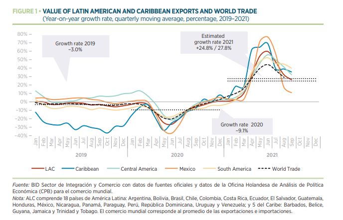 Imports were also on the rise last year the report said, “Total imports from LAC grew by 37.8 percent in 2021, after having shrunk by 15.4 percent in 2020. Imports also outperformed prepandemic levels, despite the slow, uneven recovery of the region’s economies.”