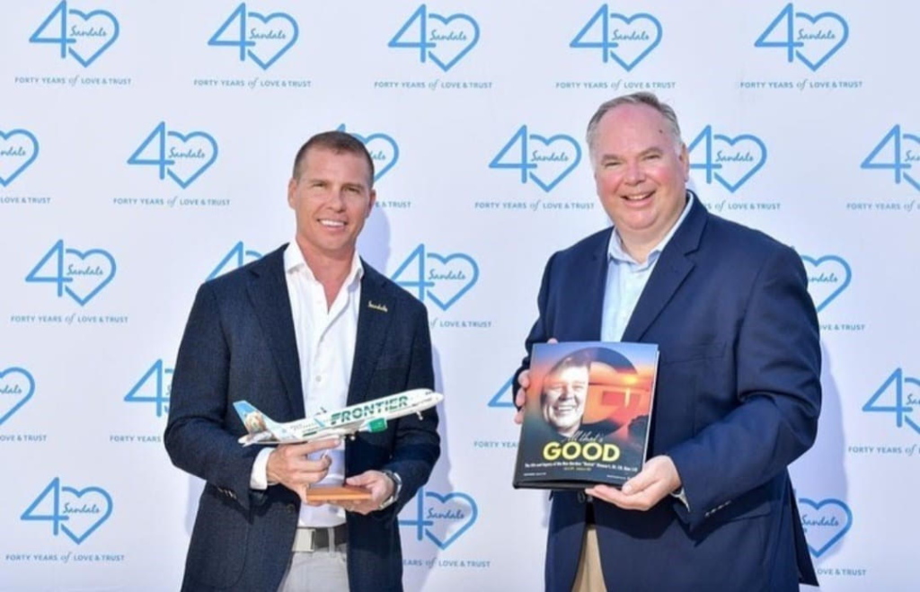 Pictured here: Executive Chairman of Sandals Resorts International, Adam Stewart, with CEO of Frontier Airlines Barry Biffle.