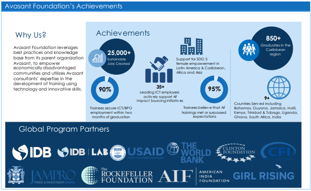 The foundation has been delivering on education, employment and entrepreneurship programmes as a recent project in Jamaica has delivered on Jamaica’s its pilot training programme in 2015 for 30 candidates in customer services for them to be hired in the growing business process outsourcing (BPO) sector. With Avasant’s intervention they have helped to have graduated over 600 deserving youth from disadvantaged backgrounds, of which over 90 percent of them having secured employment with leading information technology or BPO firms.
