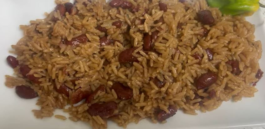 Rice and peas is a Jamaican side dish of coconut rice mixed with red beans, perfumed with spices, and a whisper of warmth from fresh chili. Traditionally cooked on the stove but I find it much safer to cook in the oven as coconut milk has a tendency to catch on the base.