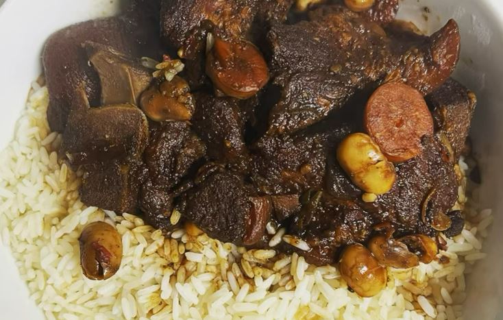 Jamaicans love pork, and the second most popular way to have pork is stewed. We like our meats dark—whether they’re grilled, broiled, or stewed. It is customary to use a darkening agent on the meat to give it some color. The other thing to do is to brown the meat, then stew it in its sauces.