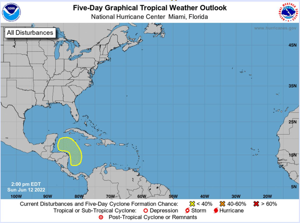 “An area of low pressure is expected to develop by the middle part of this week over the southwestern Caribbean Sea,” the NHC said in its Sunday tropical update. “Some slow development of this system is possible while it drifts generally northwestward off the coasts of Nicaragua and Honduras.”