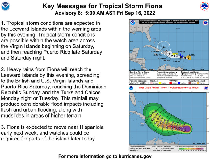 Tropical storm warnings now cover Antigua, Barbuda, St. Kitts, Nevis, Montserrat, Anguilla, Saba, St. Eustatius, St. Maarten, Guadeloupe, St. Barthélemy, and St. Martin.
