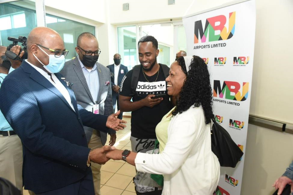 Pictured: Minister of Tourism, Jamaica, the Hon. Edmund Bartlett (at left) and Director of Tourism, Jamaica Tourist Board, Donovan White (second from left) greet Jamaica’s one millionth stop over visitor Brian Simmons (second from right) and his mother Monica Simmons (at right) as they stepped into Montego Bay’s Sangster International Airport on June 15, 2022.