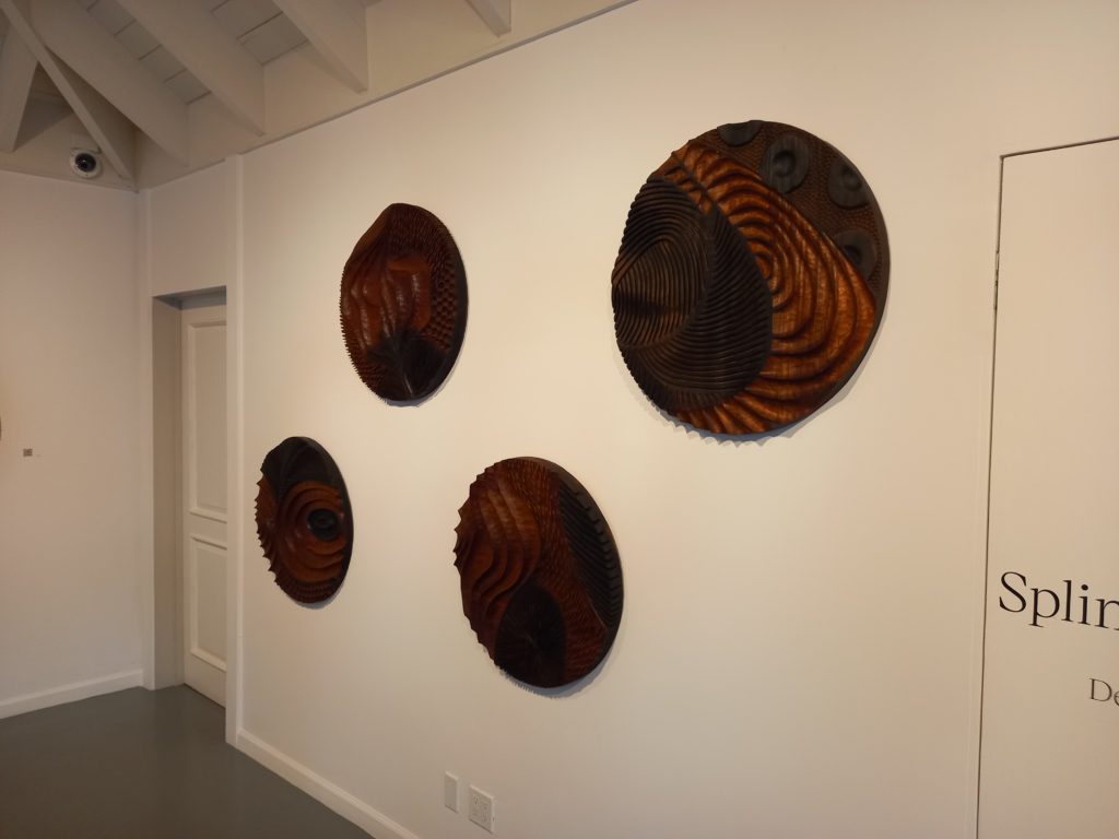 Beadle’s carbonized mahogany carvings fuse a variety of natural wood textures into single compositions. In his circular wall sculptures, round indentations, thinly etched lines and curving hollows mimic the various textures found naturally in wood, allowing these different patterns to blend into one another.
