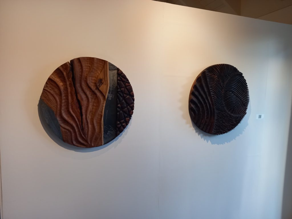 These natural patterns are echoed in the grain of the wood itself, which remains a prominent feature of these pieces despite the carbonization of the wood. The artist contrasts his circular carvings with two freestanding, upright wooden sculptures. The natural shape of the tree is referenced in these rectangular pieces, continuing the motifs of naturalistic linework and engravings.