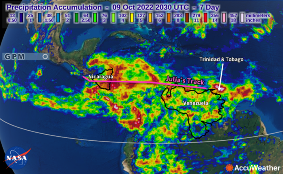 Total rainfall estimates from when Julia originated in early October to Sunday from NASA Global Precipitation Measurement shows rainfall amounts in excess of 11 inches across Nicaragua and other areas of Central America. According to the AP, highways were closed due to the heavy rains reported in Honduras, Panama and Costa Rica.
