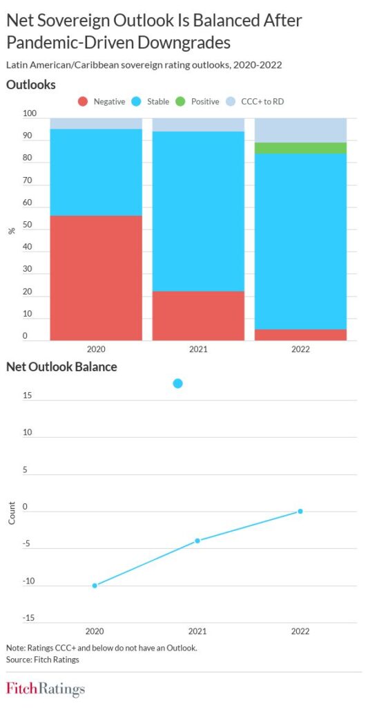 Proactive monetary tightening, expected lower inflation, steady external buffers and flexible exchange rates, and 2022’s stronger-than-expected fiscal performance will help Latin American sovereigns navigate increasingly challenging global conditions next year, Fitch Ratings says. This is reflected in Fitch’s neutral 2023 sector outlook, although political uncertainties, wide current account deficits, and the erosion of external buffers are a vulnerability for some sovereigns. The balance between Positive and Negative Rating Outlooks is even, at one each.