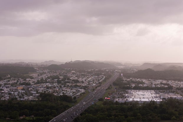 Cars drive along a highway as a cloud of dust from the Sahara Desert blankets most of the Caribbean, in Cataño, Puerto Rico, Monday, June 2, 2025.