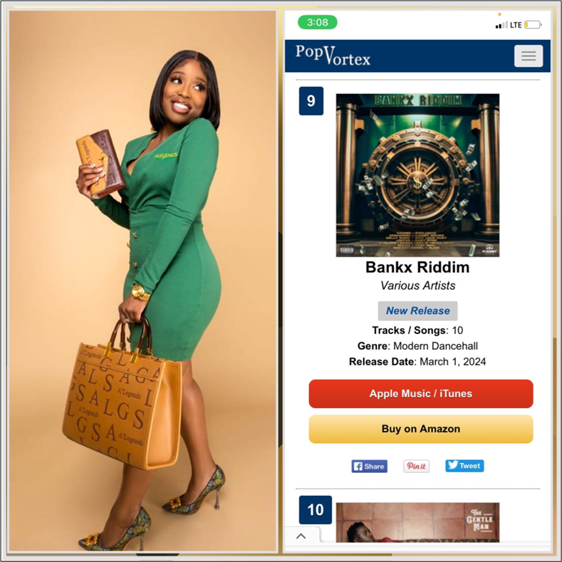 Fashion designer, actress and author turned music producer, Jenelle Alexia, is making money moves as she embarks on this new journey with her label, A’Legends Productions. Her first project, titled Bankx Riddim, debuted at number 9 upon release on March 1.