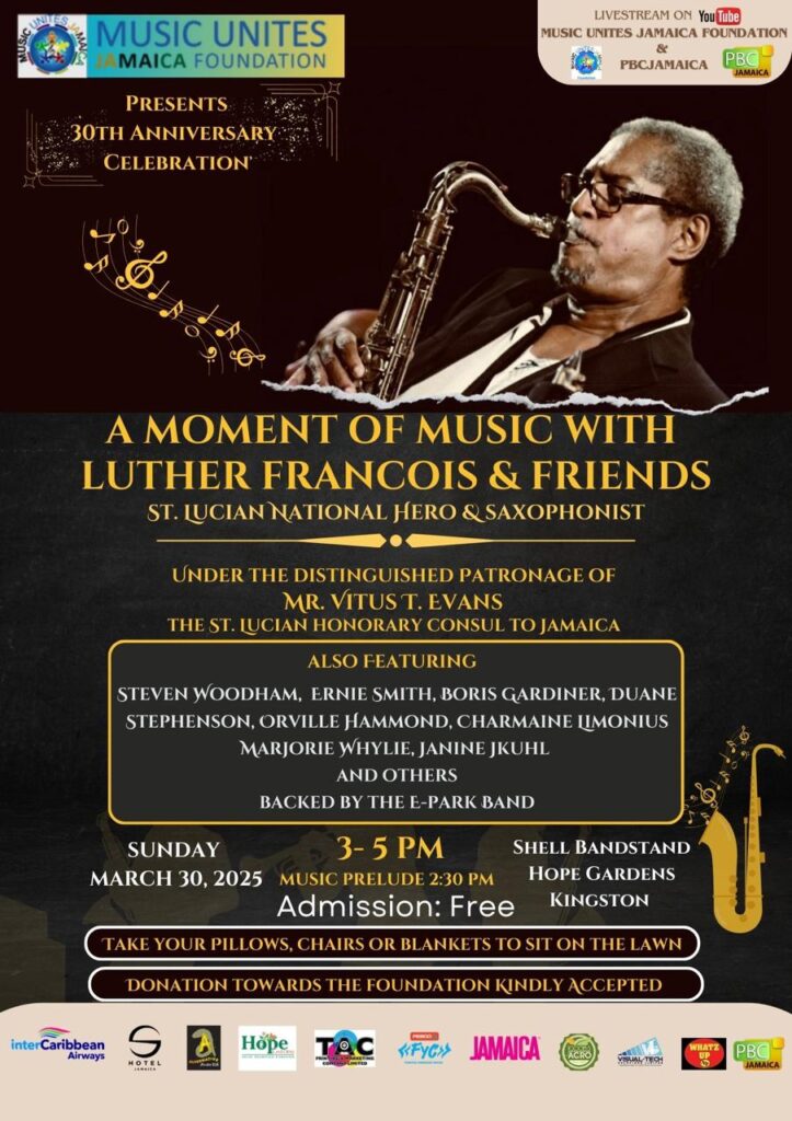 Starting with a musical prelude at 2:30 PM and the main event 3Pm to 5PM, “A Moment of Music with Luther Francois & Friends” will be a free event celebrating the rich musical ties between Jamaica and St. Lucia. Held under the distinguished patronage of Mr. Vitus T. Evans, St. Lucian Honorary Consul to Jamaica, the concert will showcase a stellar lineup of musical legends and emerging talents.