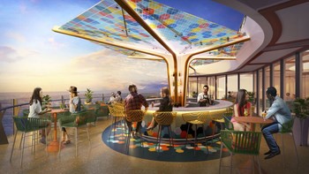 Wonder of the Seas will debut in the U.S. and Europe in 2022. The new cantilevered bar, The Vue, offers panoramic ocean views from high above on the pool deck. After sunset, it shines bright with a colorful mosaic canopy overhead.