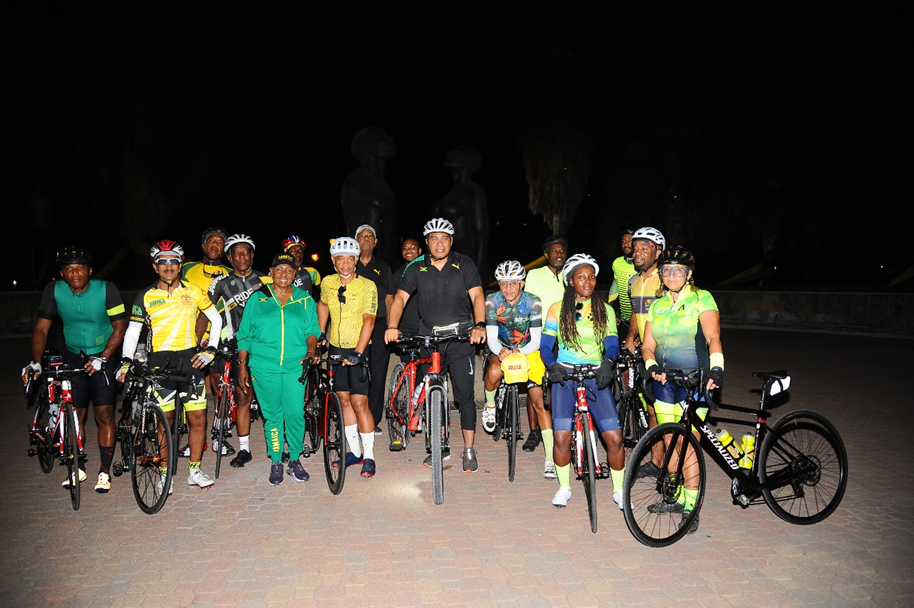 Photo Caption: Prime Minister, the Most Hon Andrew Holness (C) enjoys a moment with cyclists prior to their Jamaica 60 ride at Emancipation Park. The cyclists rode from Kingston to Montego Bay. Joining in the moment are Minister of Culture, Gender, Entertainment and Sport, Hon Olivia Granger (front L), Dennis Chung, head of the Discover Jamaica by Bike initiative (front 2nd L) and Chairman of the Jamaica Tourist Board, John Lynch (back C).