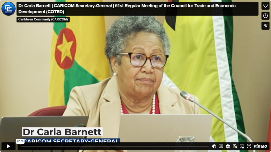 The Caribbean Community (CARICOM) Secretary-General, Dr Carla Barnett, yesterday addressed the 61st Regular Meeting of the Council for Trade and Economic Development (COTED), underscoring the Community’s solidarity with Member States severely impacted by Hurricane Melissa and reaffirming the Council’s critical role in advancing regional trade and economic resilience as the Region continues to experience climate-related shocks.