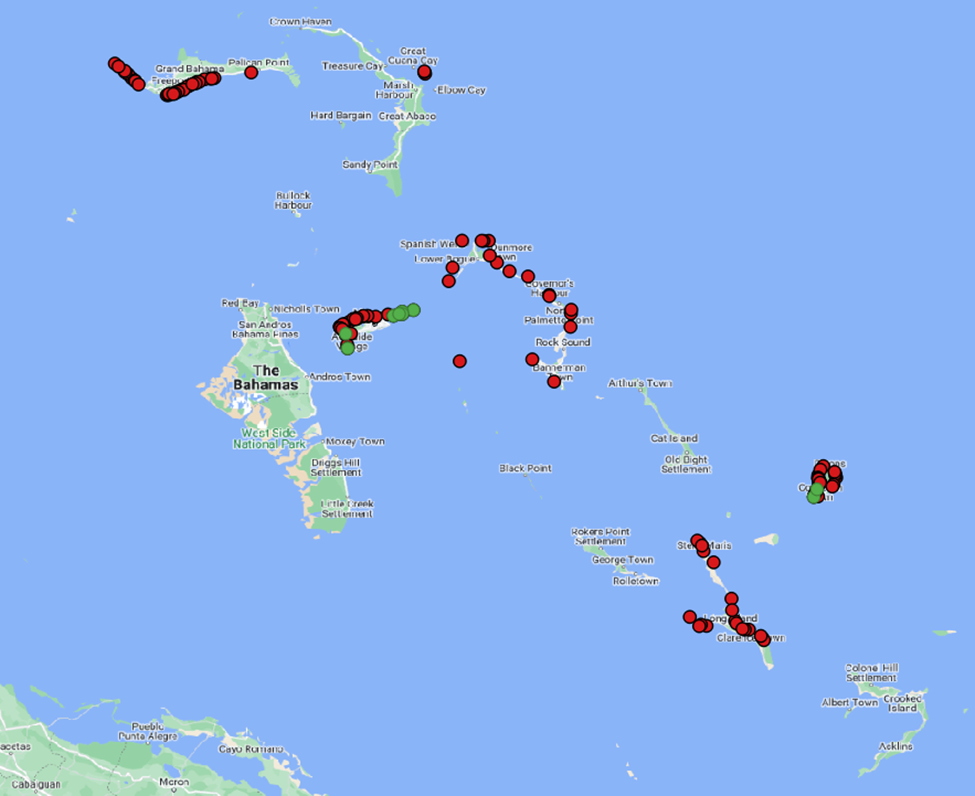 Map depicting the spread of Stony Coral Tissue Loss Disease throughout The Bahamas. Red circles indicate where the disease has been confirmed and surveyed, while green circles indicate where the Perry Institute has deployed teams to treat infected corals since the government first sanctioned their work in March.