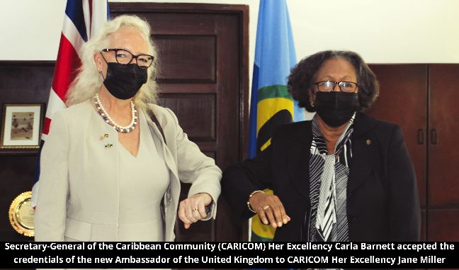 Climate Change and Covid-19 were the main issues discussed as Secretary-General of the Caribbean Community (CARICOM) Her Excellency Carla Barnett accepted the credentials of the new Ambassador of the United Kingdom to CARICOM Her Excellency Jane Miller.
