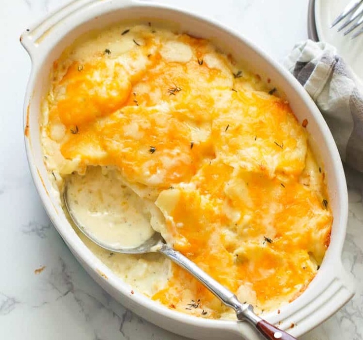 Layer in a buttered dish – start with potatoes, followed by cheese, do so until all the potatoes are used up.