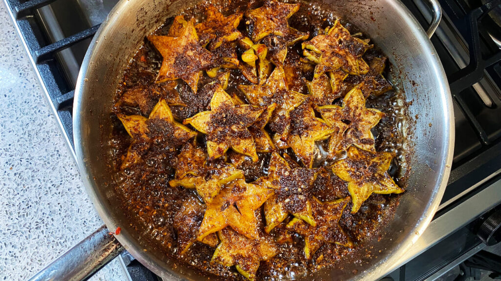 2 large Star Fruits (about 2 lbs)8-12 cloves garlic3-5 Scotch Bonnet peppers1 cup vegetable oil3 tablespoon Anchar Masala1 teaspoon salt