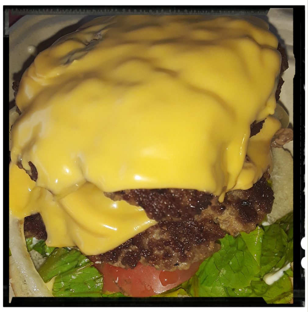 Add mayonnaise, ketchup and mustard to bottom bun. Top with lettuce, tomato, first burger and cheese. Place pickles on top of cheese. Add second burger, cheese, onions and banana peppers. On top bun, spread more mayonnaise and ketchup – cover.