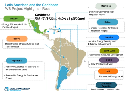 Recent International Development Association projects through the World Bank have quadrupled in its investments in the region, from $120M, to $500M, with geothermal resource development taking place in St.Lucia and Dominica, and grid modernization in the Dominican Republic.