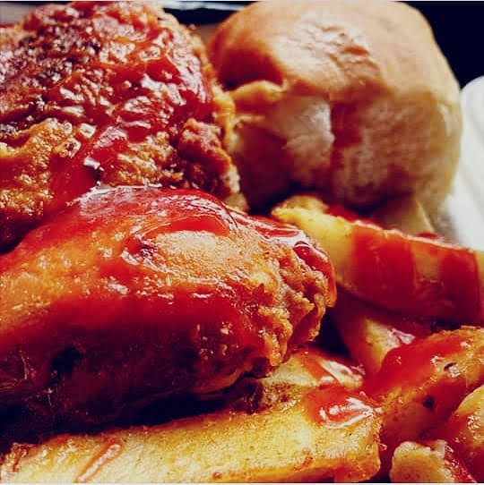 Top with ketchup, hot sauce and serve with home-made wedges and a roll.