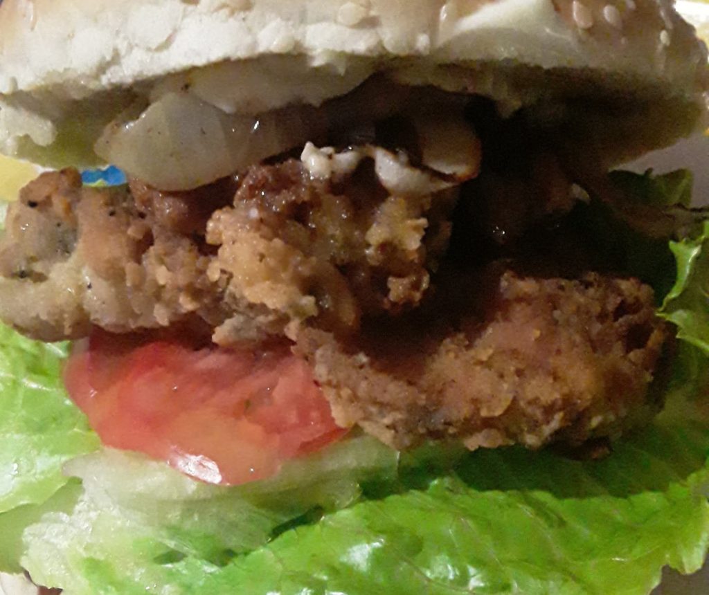 Place mayo, ketchup and mustard on bottom bun. Add lettuce, tomato, onions and pork chop. Add mayo to top bun and cover.