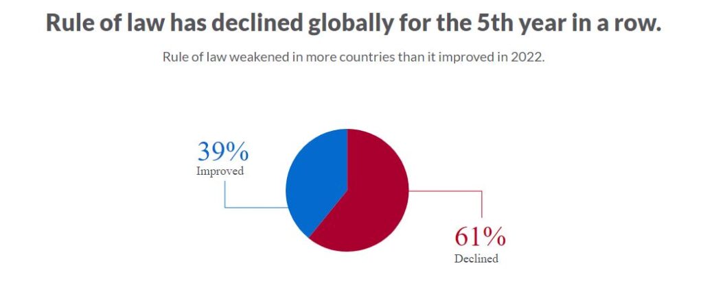 The World Justice Project’s analysis of in-depth survey data in 140 countries and jurisdictions shows that adherence to the rule of law fell in 61 percent of countries this year.