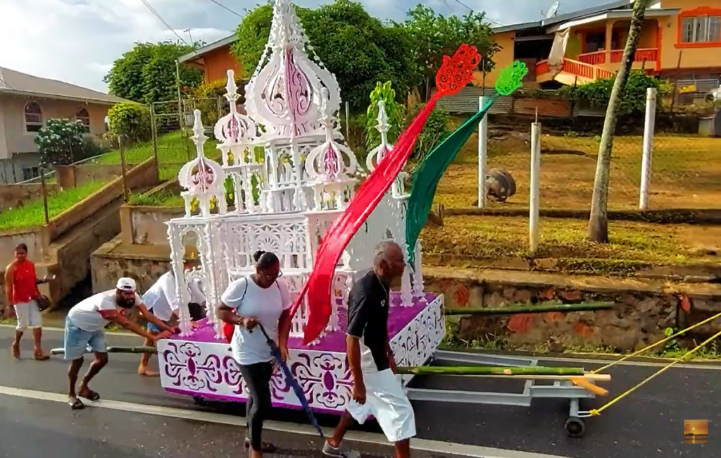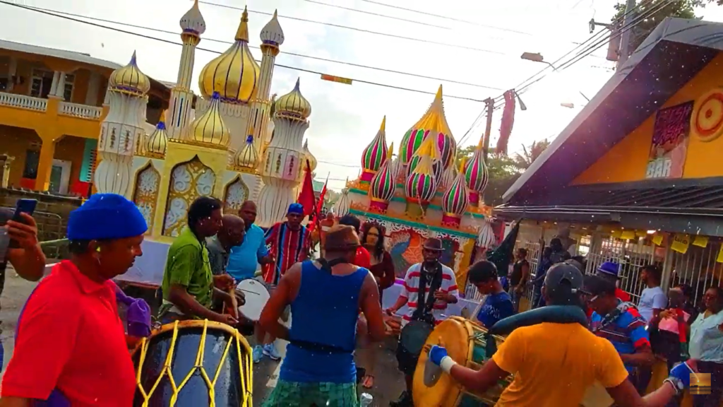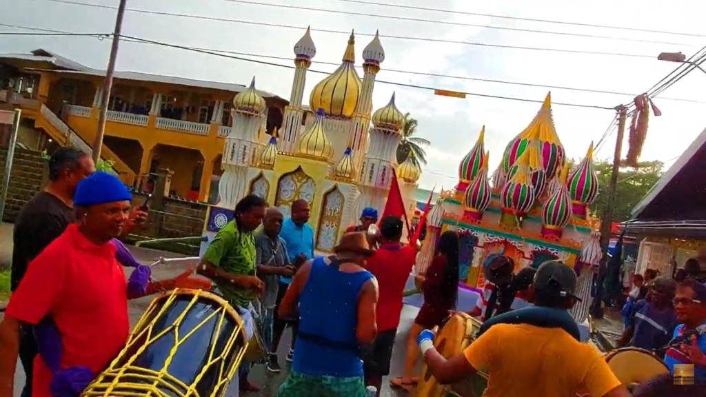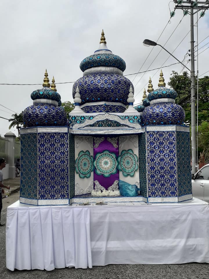 In Trinidad, the religious event attracts quite a crowd in both St James and Cedros village, with many locals in attendance observing and participating in the procession, with many invited to take pictures of the bright and shiny built miniature versions of mosques often carried by men of the faith.