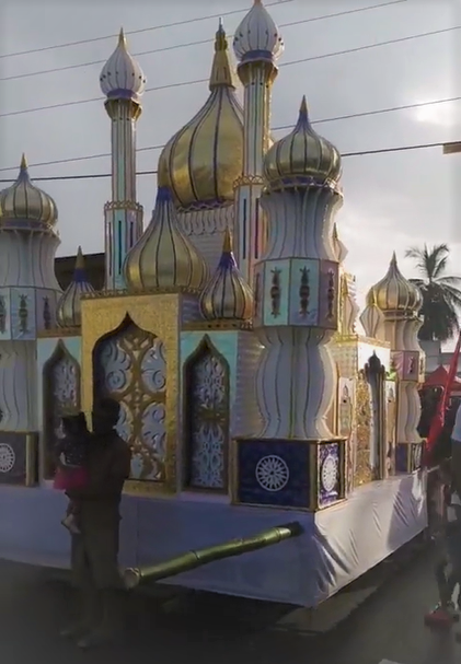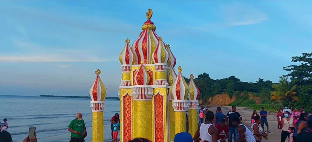 In Trinidad, multi-coloured model mausoleums or mosque-shaped model tombs known as ‘tadjahs’ are used to display the symbolic part of this commemoration. They are built and paraded, then ritually taken to the sea on last day of observance, for discarding into the water. However, this has now been changed to more environmentally conscious disposals, with the tadjahs returned to the yard, where materials are now recycled and set aside for reuse in future celebrations.