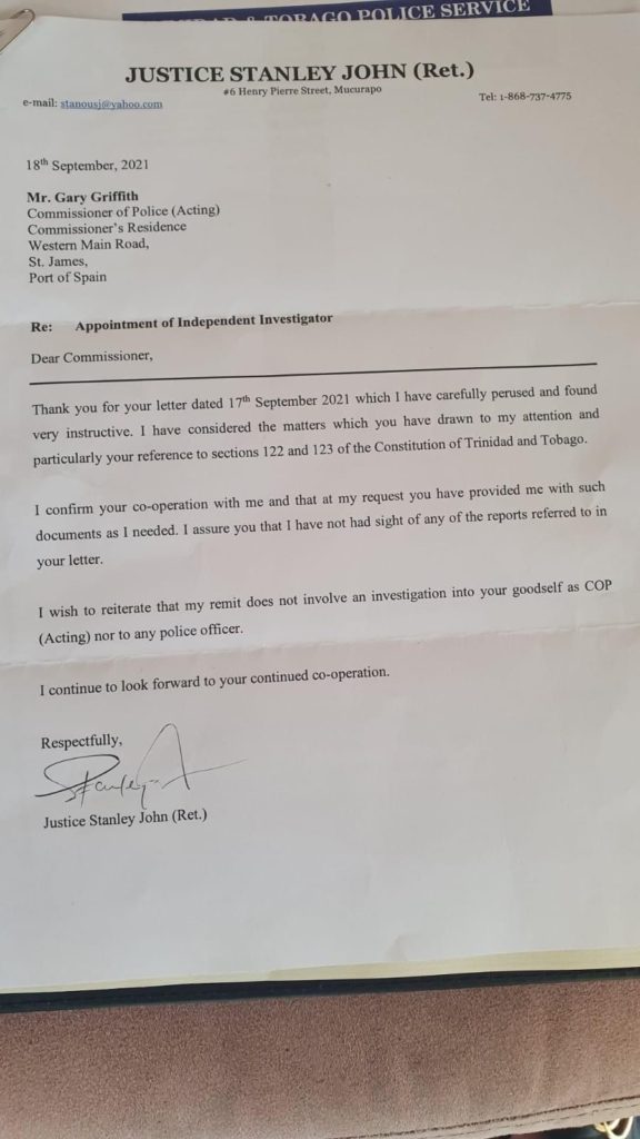 In its letter to Griffith dated September 17, the PSC determined that it was not in the public interest or the interest of the Police Service to have Griffith on the job while retired Justice Stanley John is conducting his investigation.