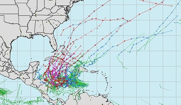 The second suggests the system stays weak and develops deeper in the Caribbean, moving closer to Nicaragua or Honduras.